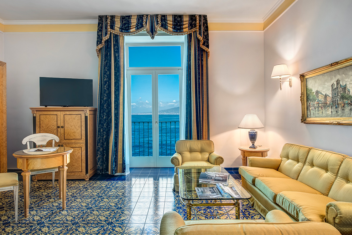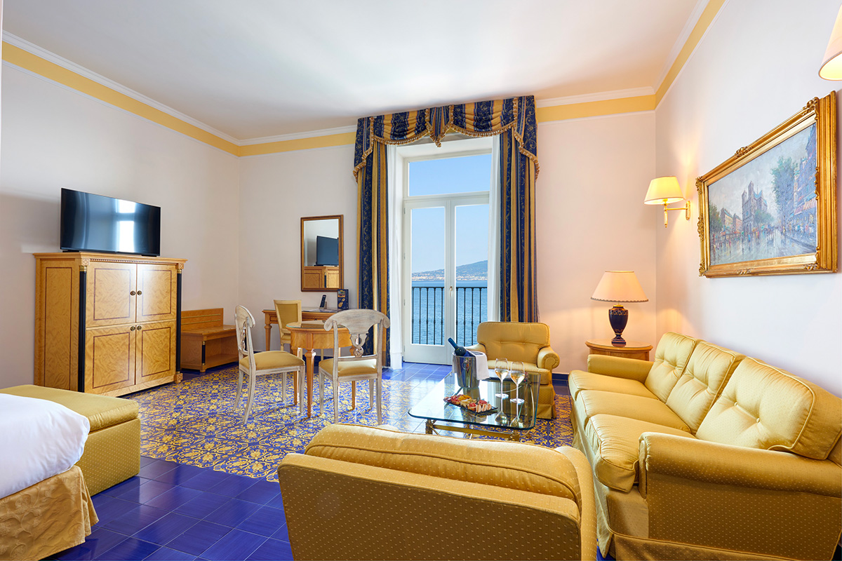 Suite Senior, Suite con vistas al mar, TV por satélite, caja fuerte, aire acondicionado con control individual de junio a septiembre, teléfono directo, algunas con jacuzzi.
