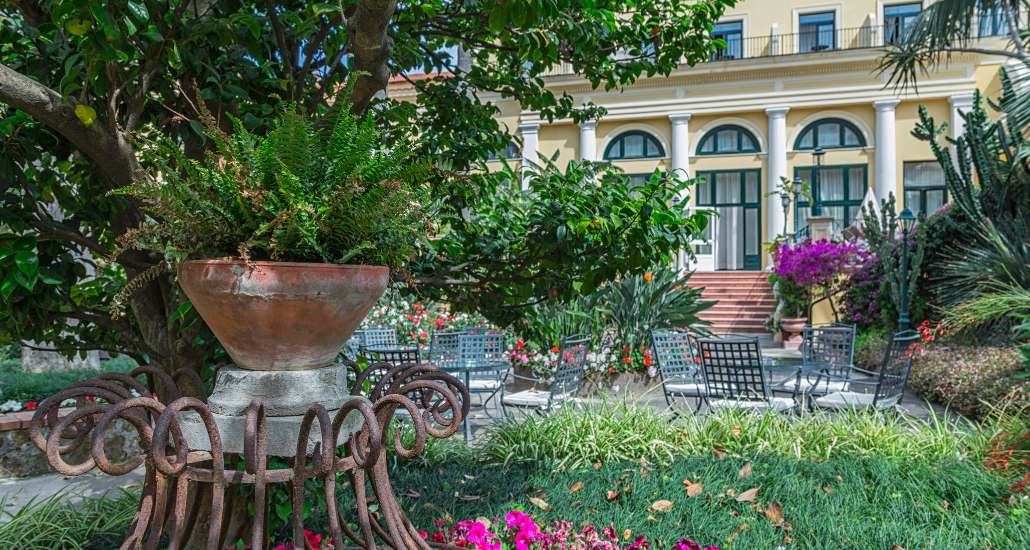 The elegant reception hall, called Sala Quattro Stagioni (Four Seasons Room), gives us back the atmosphere of that time, with its frescoes consisting of four female figures representing Spring, Summer, Autumn and Winter, and the antique furniture inlaid by old Sorrentine workers.